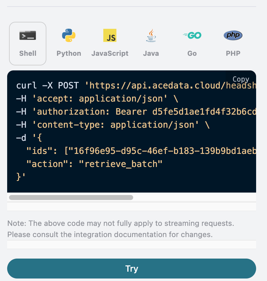 我们以 AI证件照制作 API 服务返回的任务ID一个为例,演示如何使用该 API。假设我们有一个任务ID:16f96e95-d95c-46ef-b183-139b9bd1aebd,接下来演示如何通过传入一个任务ID来。