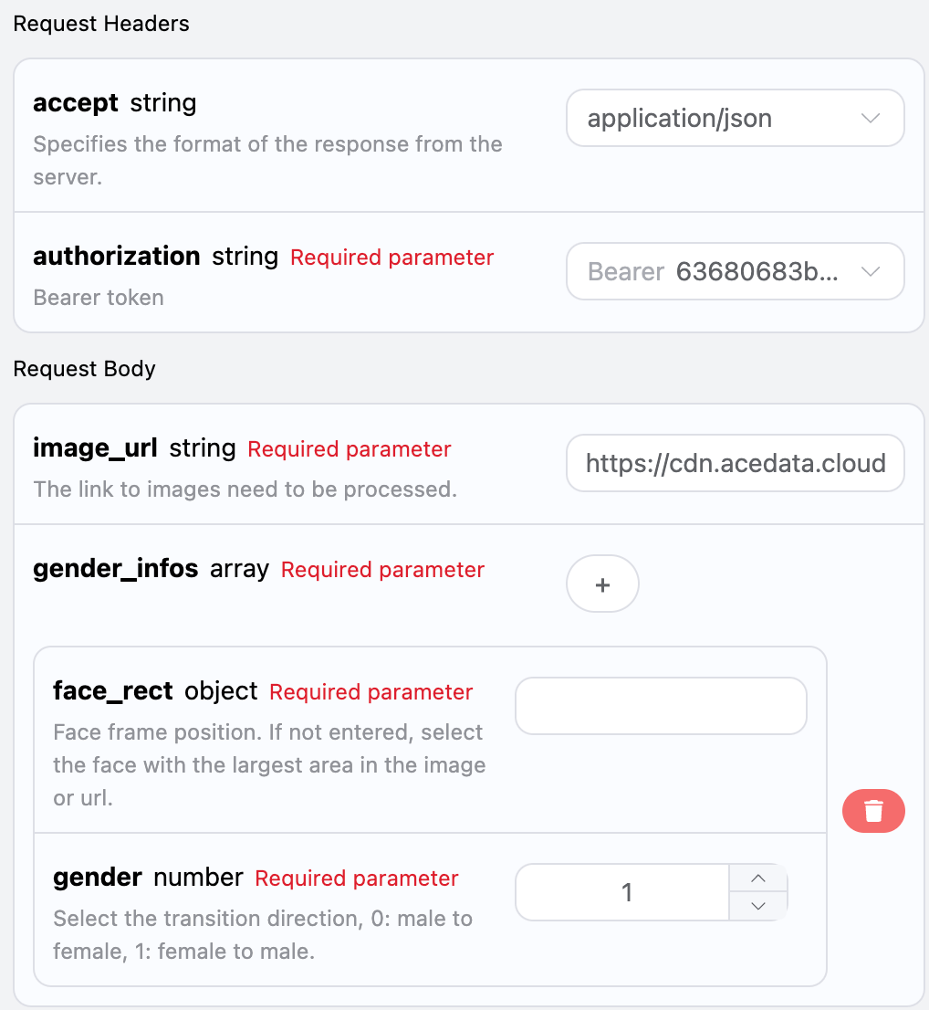 image_url:需要处理的人脸图片链接。gender_infos:关于人脸性别和区域信息,其中性别是必选参数,0表示由男性变为女性,1表示女性变为男性。